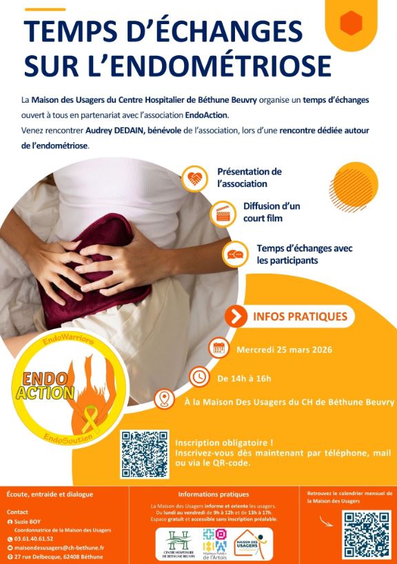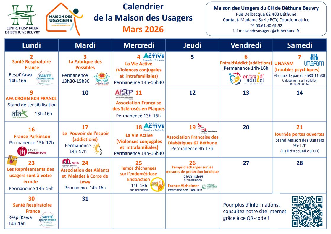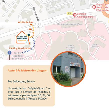La Maison des Usagers de Béthune Beuvry est joignable au 03.61.40.61.52 et par mél : maisondesusagers@ch-bethune.fr